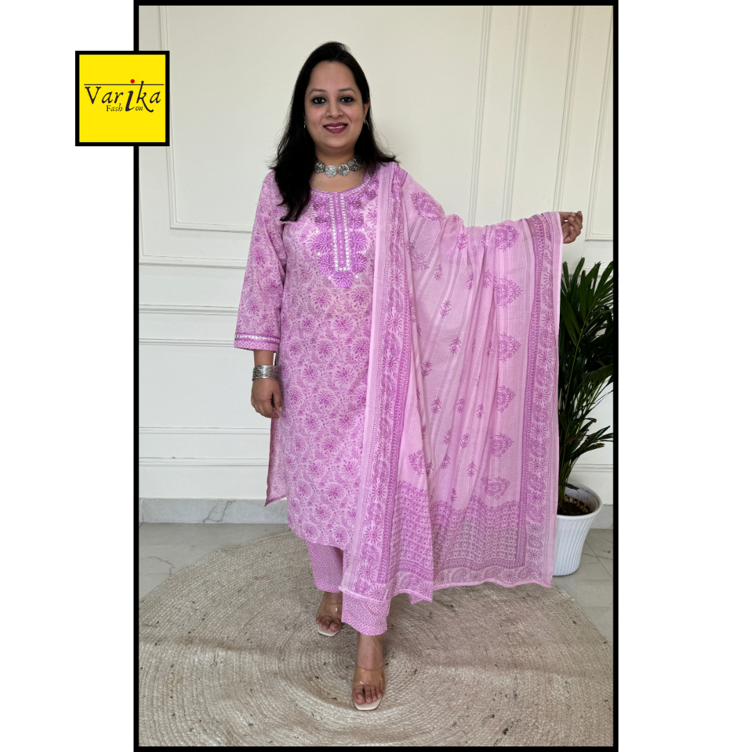 Subtle Self Thread Embroidered Block Print Suit Set-Pink Colour