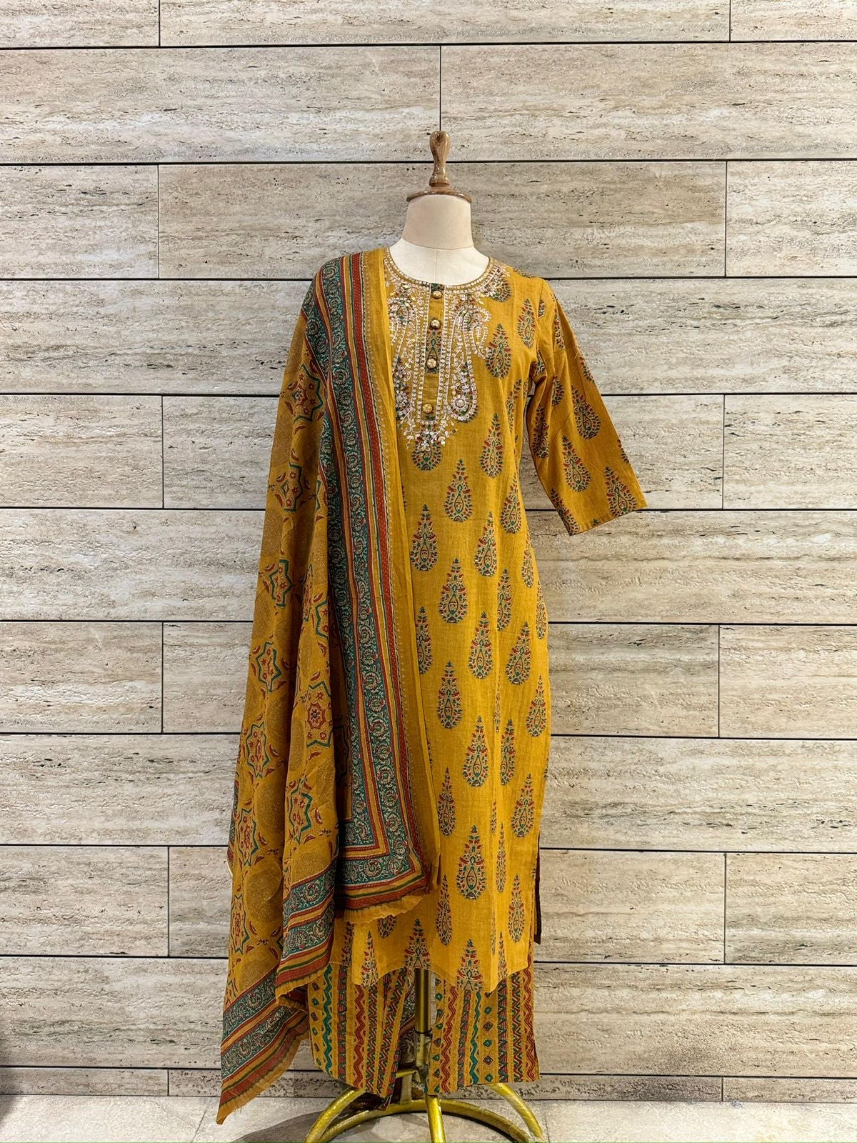 Hand Embroiery Dola Silk Mustard Colour 3pc Suit
