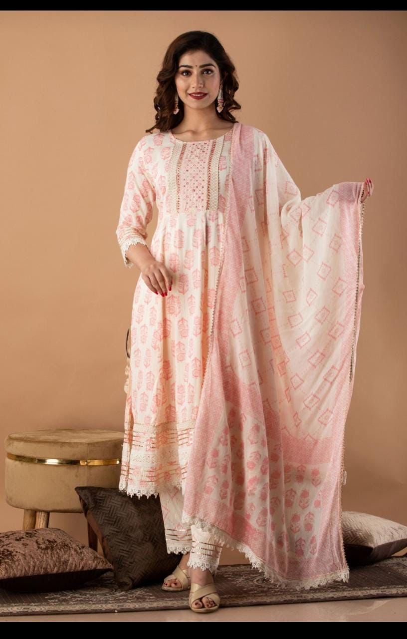 Lurex Rayon beautiful 3 pc anarkali suit set. The kurta yoke has beautiful sequins embroidery and its teamed up with a printed pants and printed cotton dupatta.