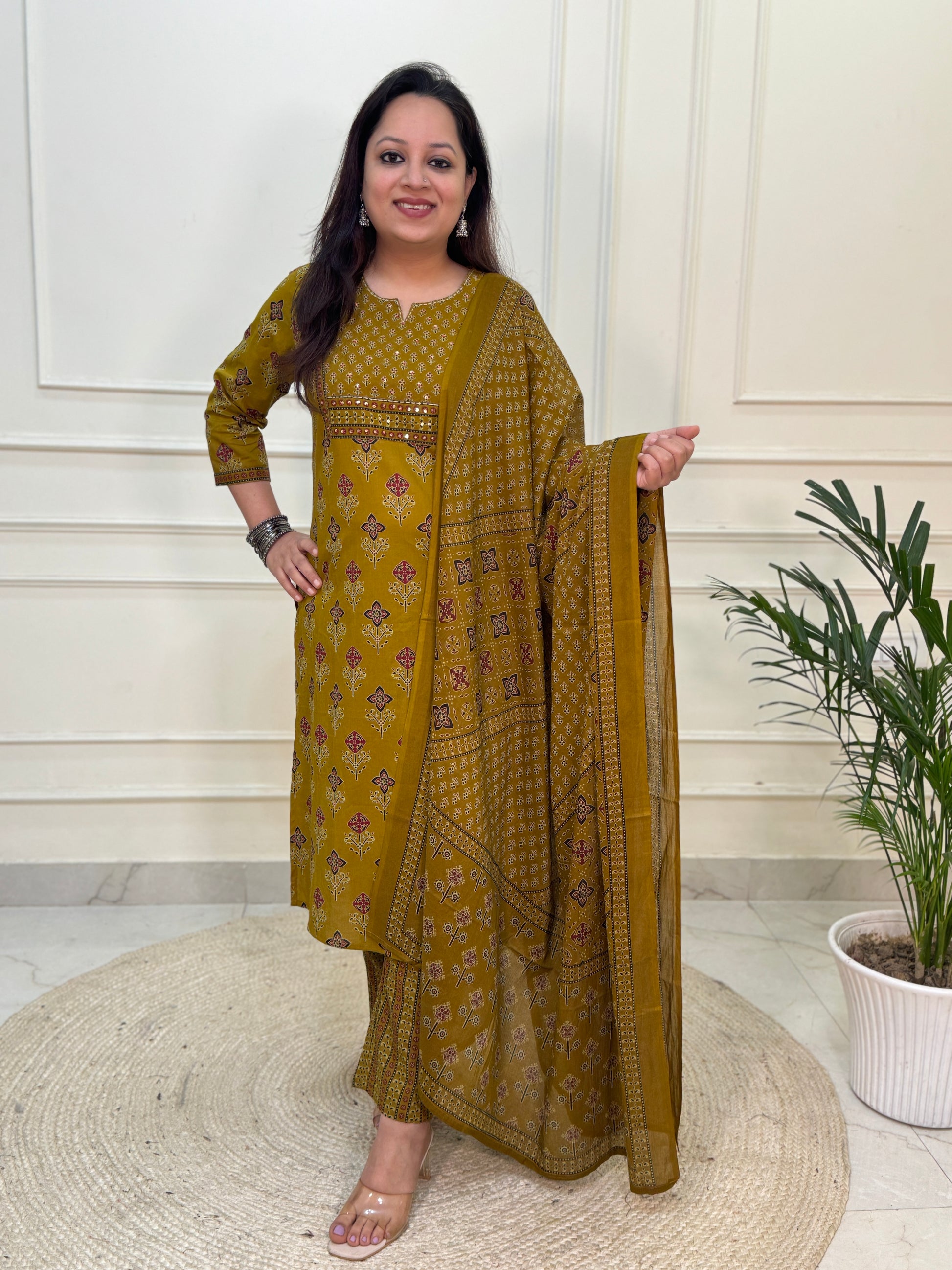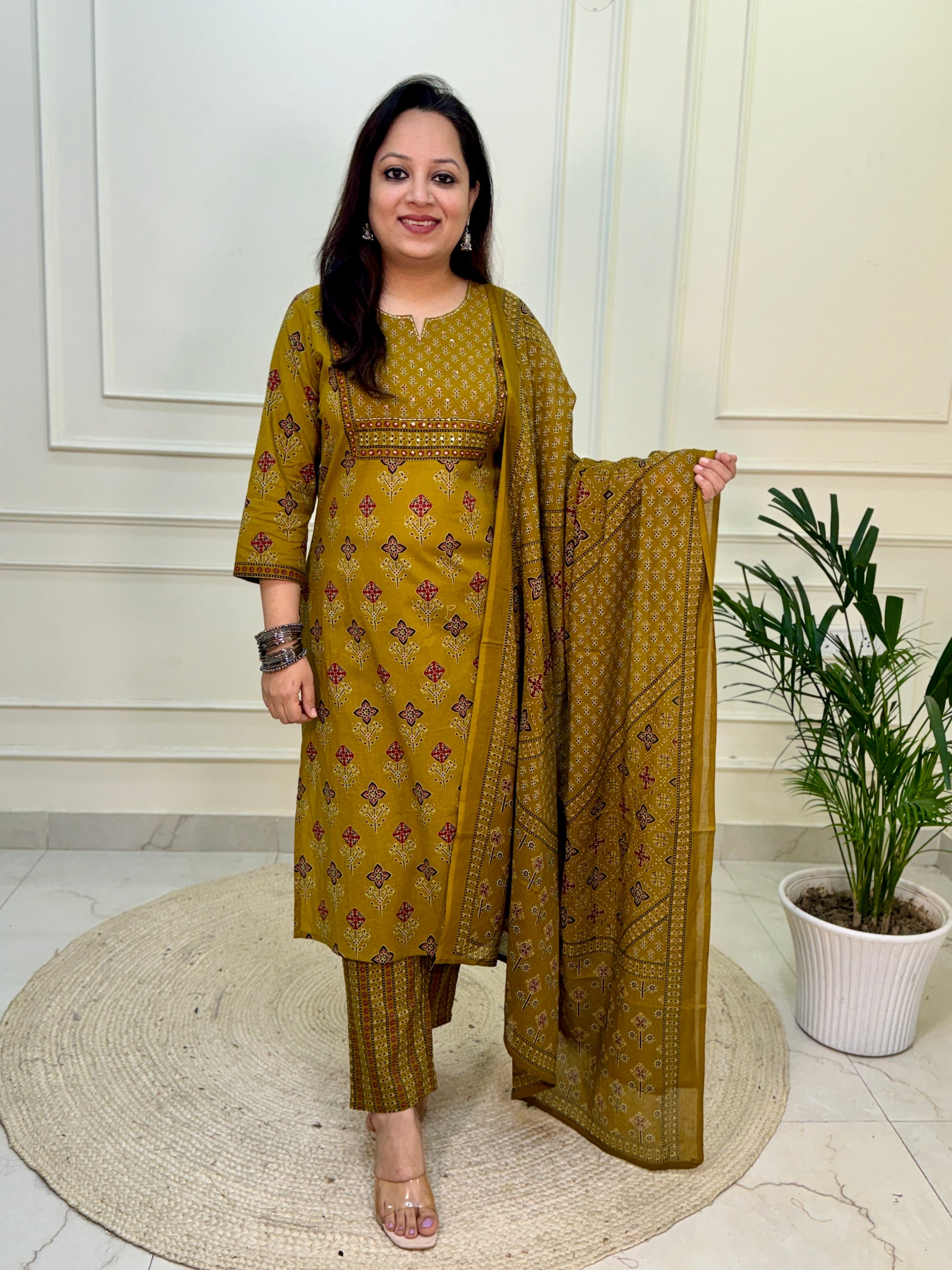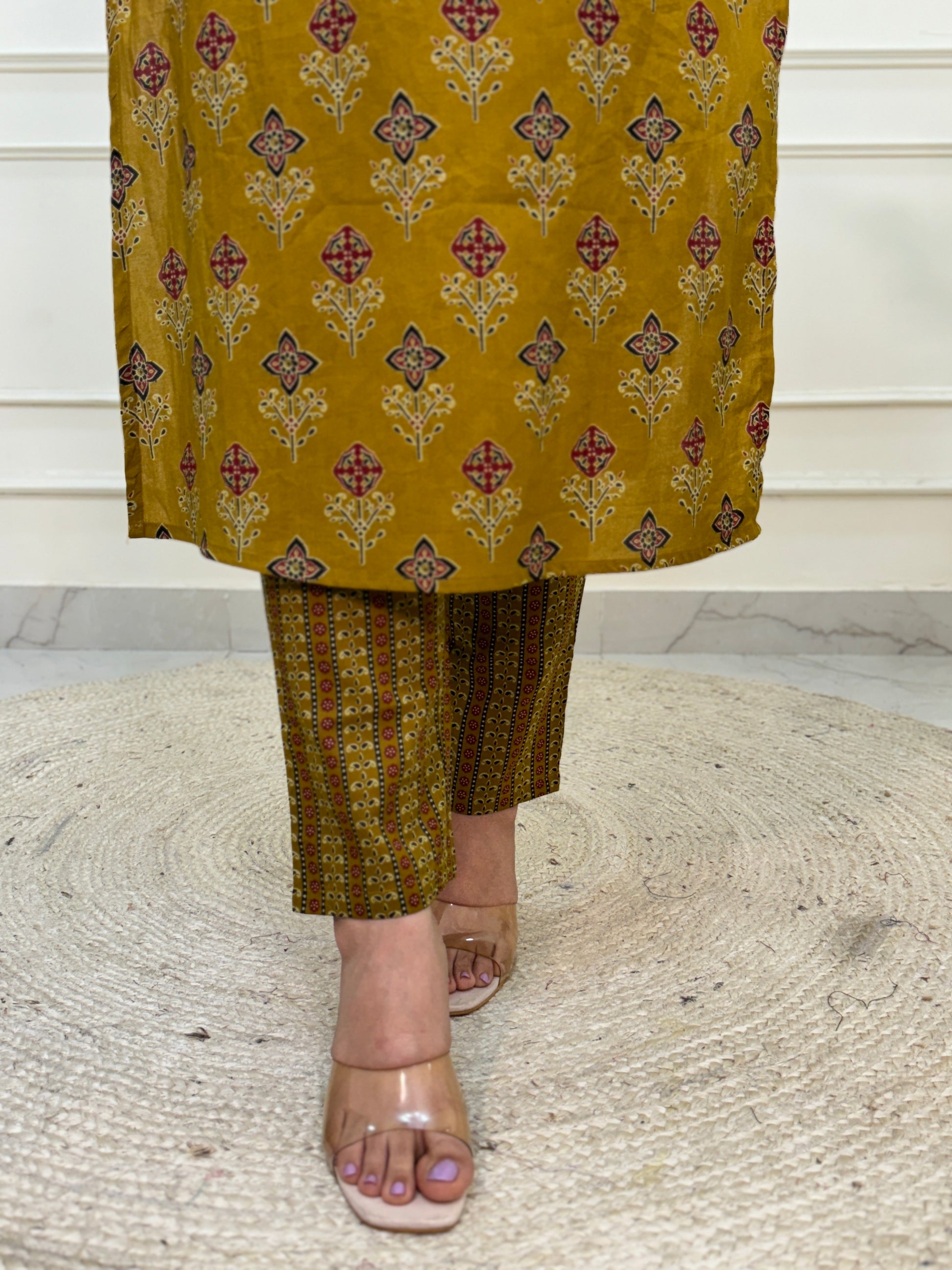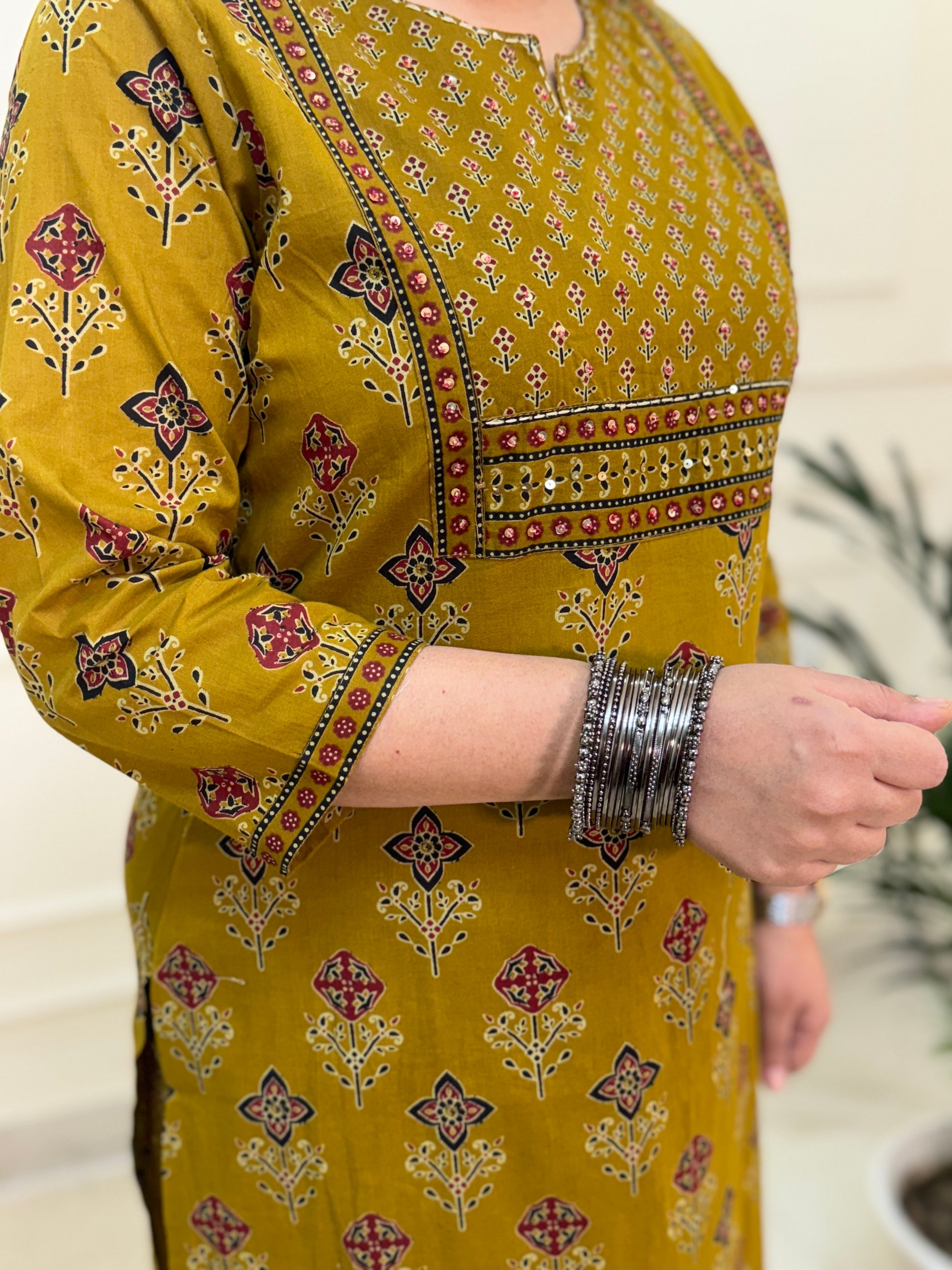 Zena premium Cotton Ajrakh Suit Set- Mustard